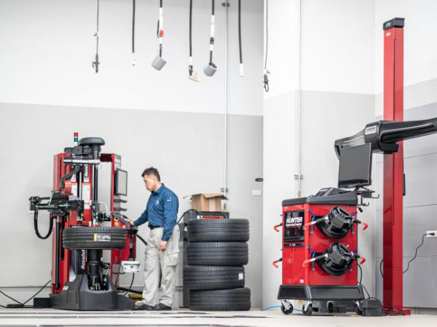 To service vehicle alignments, we have installed the HawkEye Elite® alignment system with over 5,000 vehicle-specific photos and illustrations to assist. Our Road Force® Elite wheel balancer uses the laser vision system to improve balancing accuracy. Our Revolution™ tyre changer with convenient touchscreen interface enforces wheel and technician safety. Each of our Hunter machines provides high-speed and high-accuracy performance. This provides great benefit for our customers and our business.